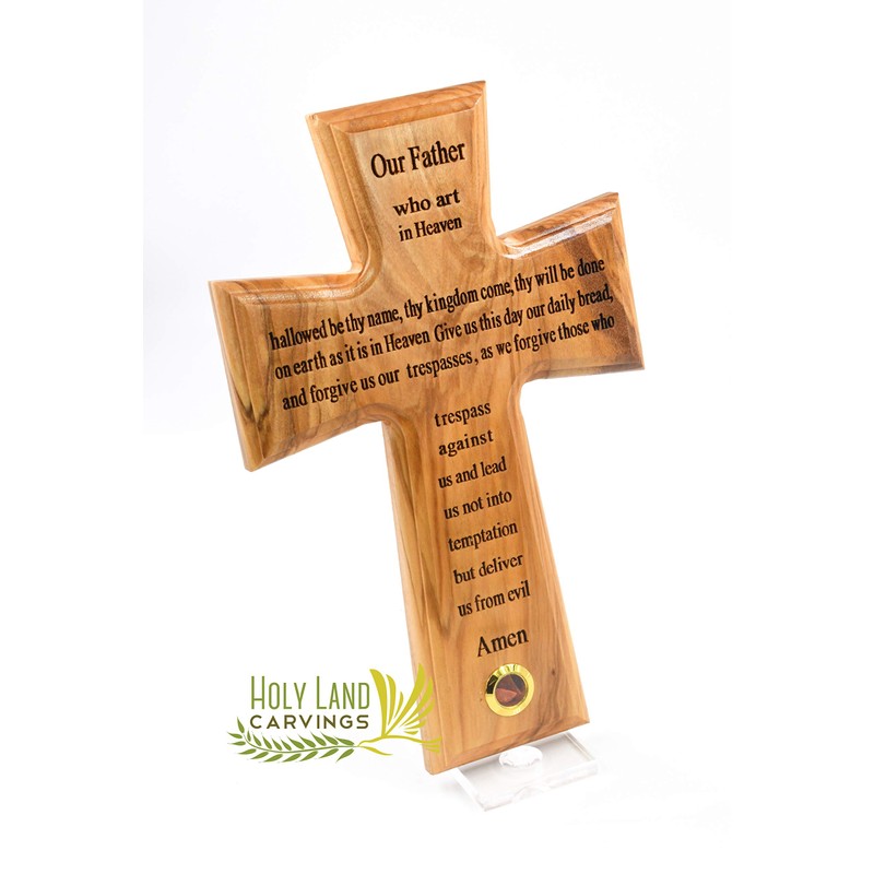 - Beautiful Olive Wood Cross Hand Carved in the Holy Land with Laser Engraved Our Father Prayer.