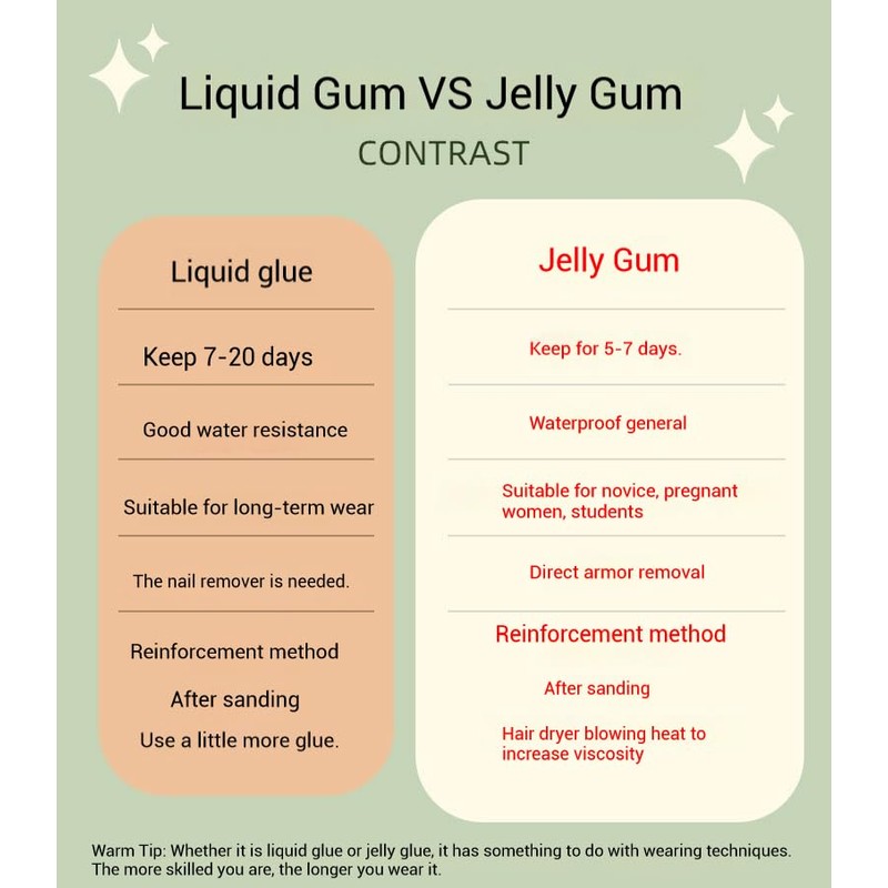 - You can complete nail art within 5 minutes. First, clean your fingers, choose the right size, then apply jelly glue to your nails, and then press your nails for 10 seconds! And avoid water within the first hour of wearing. Soak it with warm water for 10 minutes when replacing the fake nails, and easily lift your nails from the side to avoid damage.