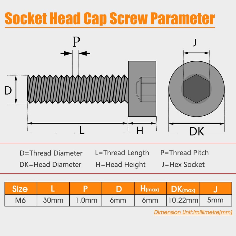 • 🛠️【Screw Parameters】Product name: M6x30mm Socket Head Cap Screw; Hardness grade: 12.9; Color: Black; Size: M6x30mm; Screw length: 36mm; Thread pitch: 1.0mm, thread length:30mm; Thread type: fu4l thread;Coarse thread.