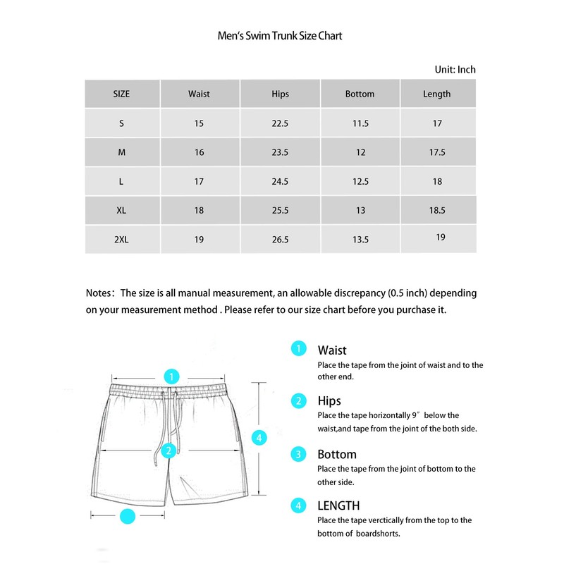 - Mens Boardshorts Feature:Made up with the waterproof fabric,This men's swim trunk features highly elastic waistband with drawstring closure, so the waist differes by 10 inches at least from relax to stretch, you can adjust the most suitable "waist", and with the double-needle stitching and they are comfortable and durable to wear.