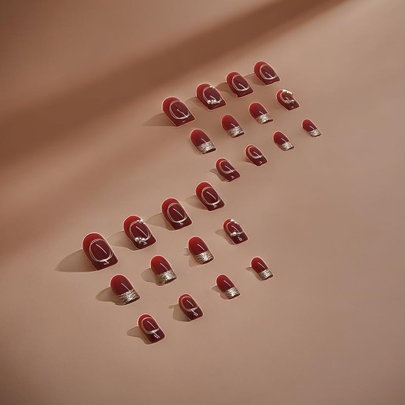 Generic New Year's Medium Acrylic Press On Nails - Easy to Wear, European Shape, Sweet Chinese Style, burgundy