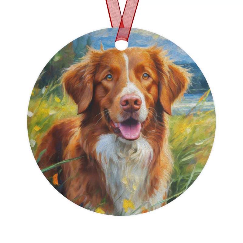 Enhance the festive ambiance of your home with our Nova Scotia Duck Tolling Retriever 'Dixie' Metal Ornaments. Made from high-quality white aluminium, these ornaments are not just decorations but fine art pieces for your Christmas tree. The glossy finish and the ability to print on both sides allow you to showcase intricate designs in high resolution. Each pack includes a single ornament in your chosen shape – Bell, Tree, Round, or Oval – accompanied by a separate red ribbon for hanging. Elevate your holiday decor with these luxurious and durable ornaments that will bring joy and elegance to your Christmas celebrations for years to come.