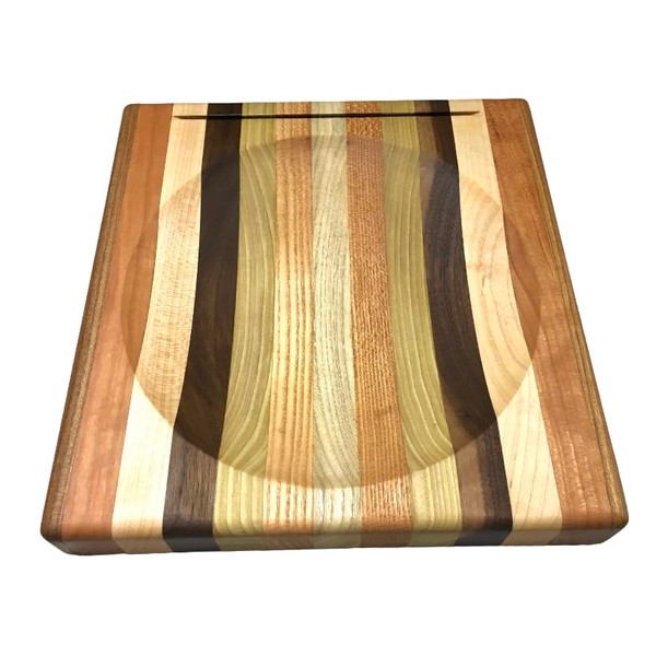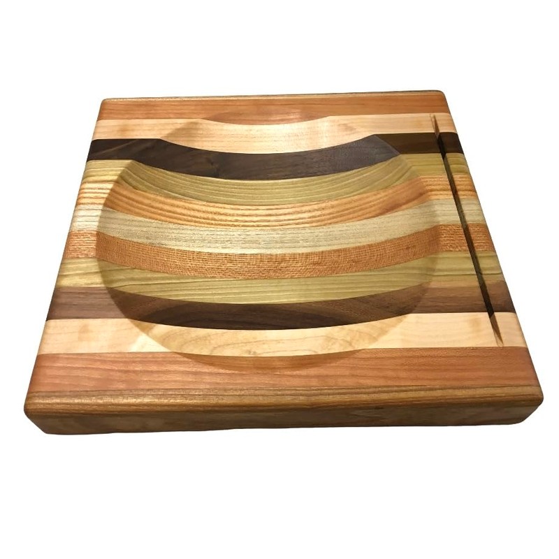USA Made Xl Size Custom Handcrafted in USA Wood Ulu Knife Cutting Chopping Bowl/Board 9.5" x 10" 8" Bowl X-large sized board for Ulu and Mezzanine knives Board size: 1.35” Thick x 9.5” x 10” long on the board 7” Top slot for Ulu knife stand to rest while not in use Large bowl size is 8” across Handcrafted cutting boards made from domestic woods in their natural color. Wash with dish detergent and dry thoroughly. Do not put it in the dishwasher. If it becomes dry, rub the surface with mineral oil. We designed this traditional style board / bowl to use everyday.