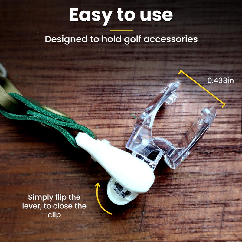 Putter cover holder with brass carabiner and genuine leather belt. The wide-opening clip holds any putter cover securely. It can be used for gloves, towels, etc. as well as putter covers.