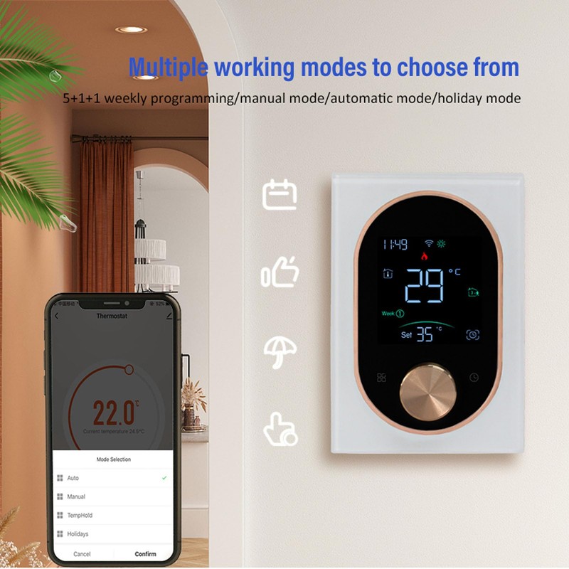 - [Manual and Programmable Modes] This room thermostat offers both manual and programmable modes, allowing you to set the temperature of your wall mounted thermostat to your preferred level, thereby reducing energy costs. It also supports smart voice control and is compatible with various voice APPs