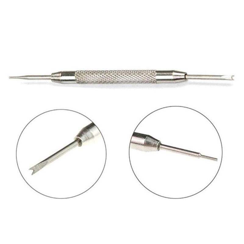 The straight flat-head pin end can be used to push spring bars in drilled lugs or buckles and to fine-tune the fit of straps and bracelets with micro-adjustable clasps.