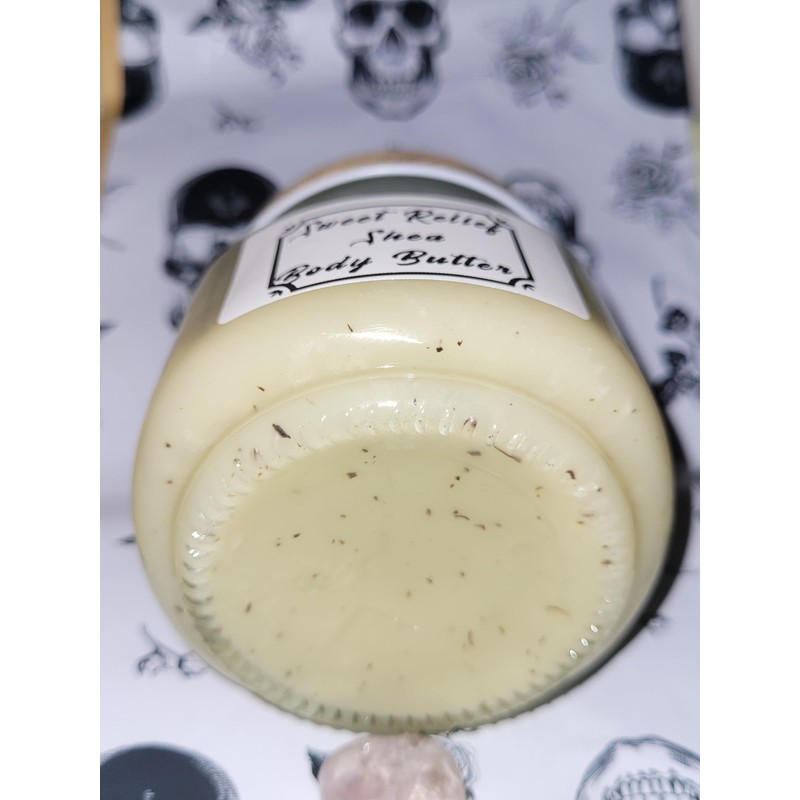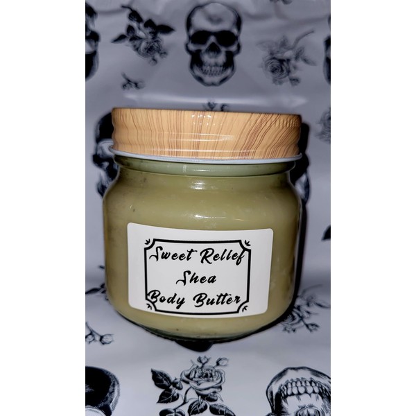 One, 8oz Sweet relief shea body butter. Made with Arnica flowers, White willow bark and St Johns wart Rose and honey suckle as the relief components. Sweet aroma of vanilla,sweet orange and Jasmine notes with almond oil. Made with high quality, organic ingrediants. HAND MADE BY EMERALD BOA APOTHECARY