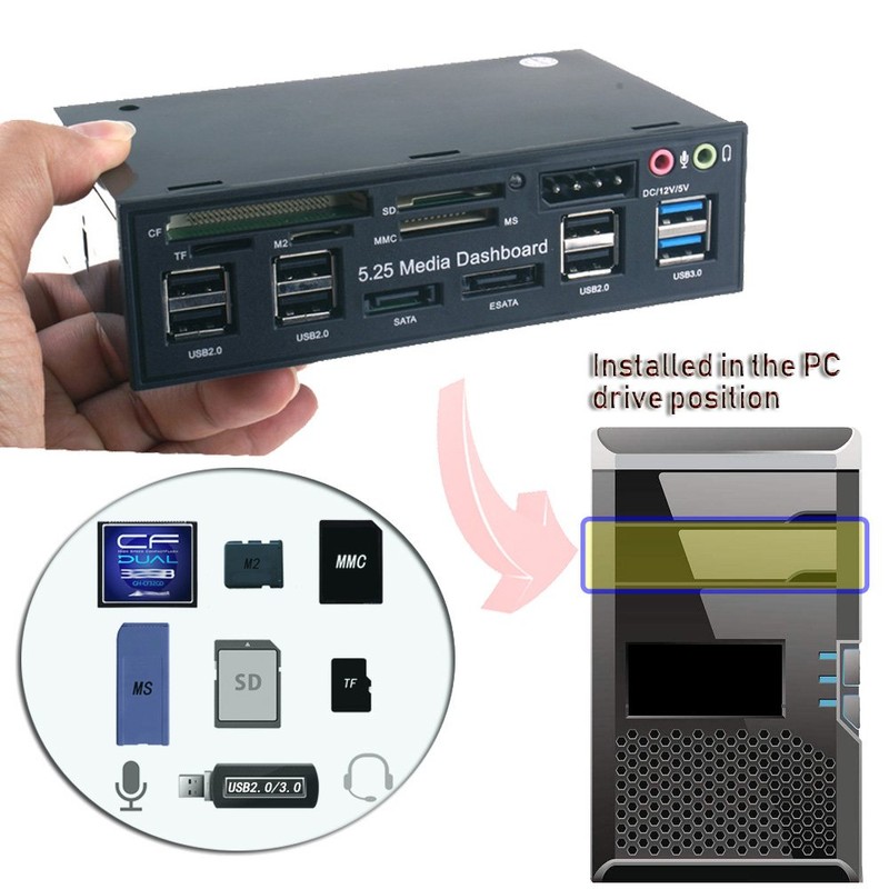 Generic T-SIDAKE 5.25 Inch PC Multifunctional Dashboard Media Front Panel Audio, with SATA e-SATA Dual USB 3.0 6 Port USB 2.0 Five-in-ONE Card Reader (SDMMCCFMSTF M2), Black, (SDK-QL5E)