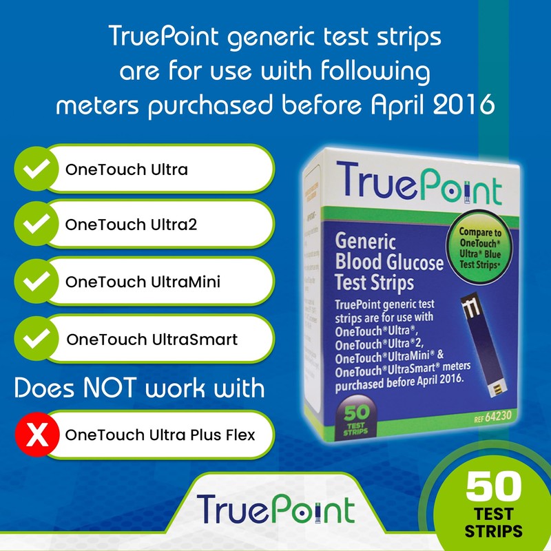 TruePoint Generic Test Strips 50 Count for Use with OneTouch Ultra, Ultra 2, and UltraMini & UltraSmart meters purchased BEFORE APRIL 2016. TruePoint Generic Test Strips DO NOT WORK WITH OneTouch Ultra Plus Flex meter.