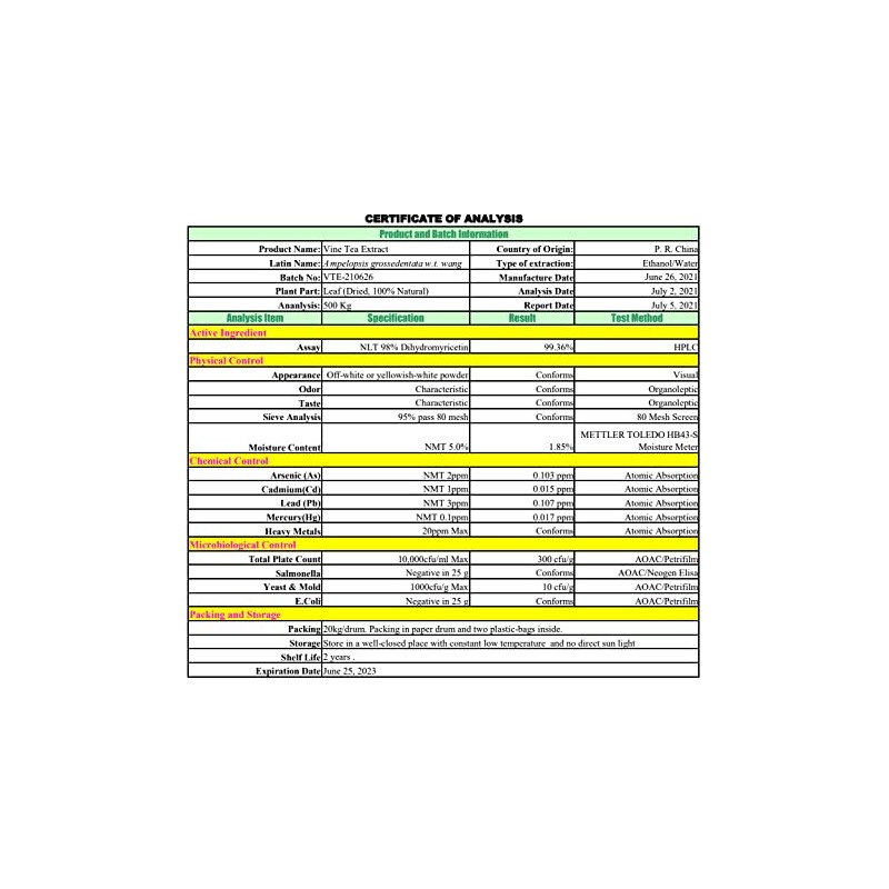 Vine Tea Extract from Florida SuperfoodsOrigin: Origin may vary per lot - Refer to certificate of analysisBotanical Name: Ampelopsis GrossedentataPart Used: LeafOther Ingredients: None