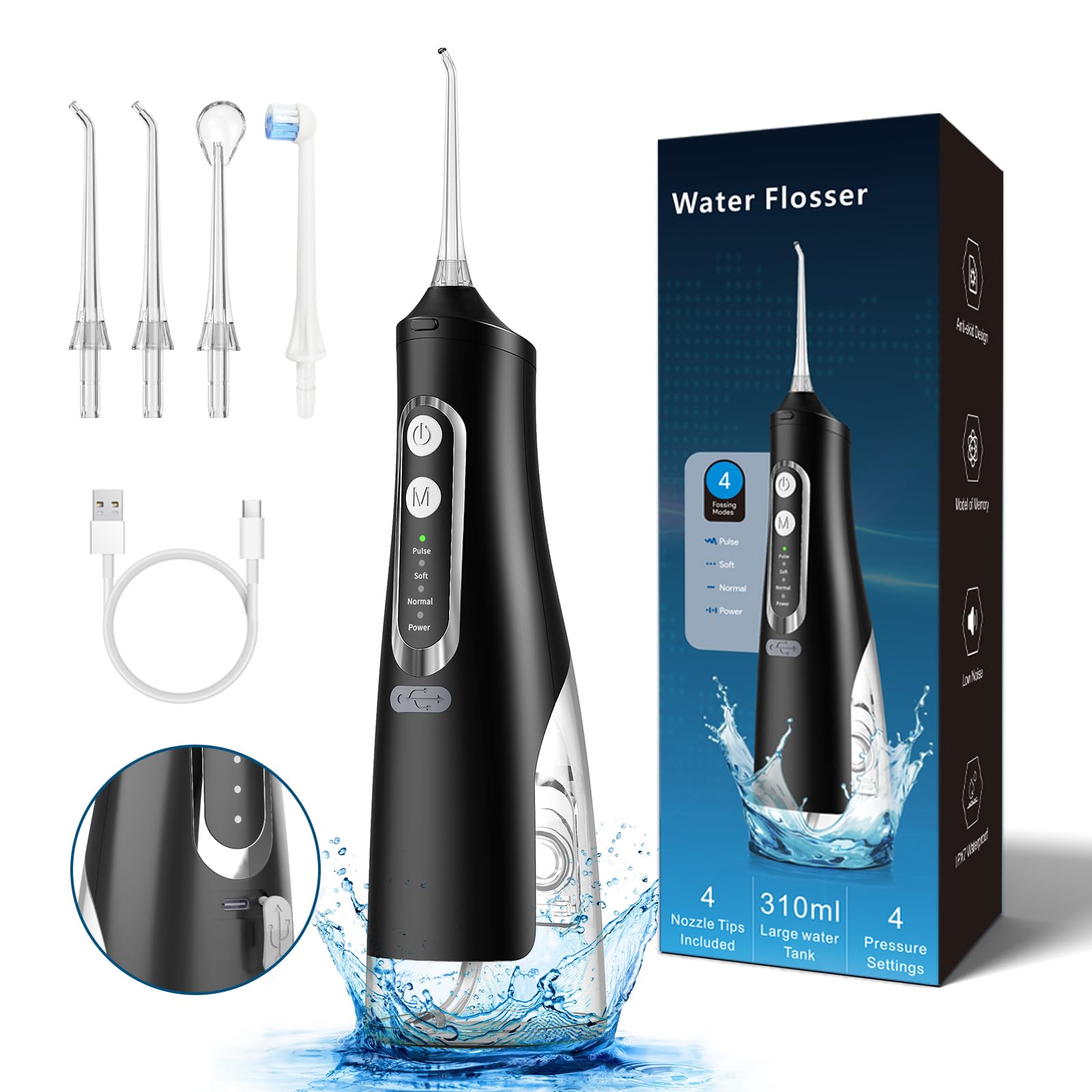 Generic Water Flosser for Advance Teeth Cleaning - 4 Modes Cordless Portable Oral Care Irrigator, 4 Jet Tips, 310ML Water Tank Capacity with IPX7 Waterproof Dental Floss Cleaning Device (Black)