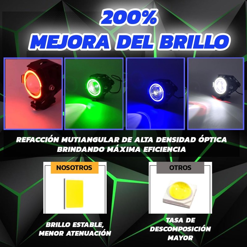 【Iluminación Potente y Estilo Impactante】Diseñados para proporcionar una iluminación potente y un estilo impactante, estos faros no solo destacan tu moto, sino que también mejoran tu seguridad durante la conducción nocturna. En todos los casos la luz primaria es blanca y tienen un led rojo en el interior del foco que es el ojo de demonio. Las variantes en los colores se encuentran en los aros del foco que pueden ser blanco, rojo o azul.