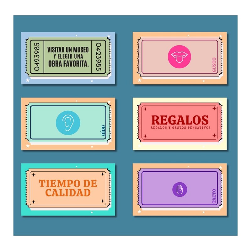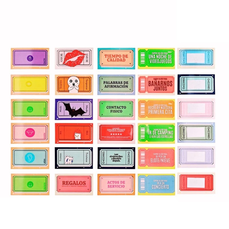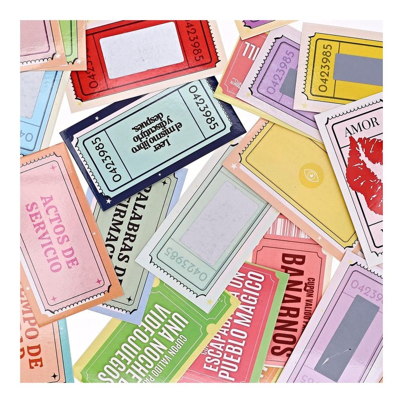 - ✔ 22 cupones rascables de citas para vivir momentos inolvidables. ✔ 5 cupones de emociones (amor, tristeza, ira, etc.), para conocerse mejor. ✔ 5 cupones de los sentidos, diseñados para explorar nuevas sensaciones. ✔ 5 cupones basados en los 5 lenguajes del amor, para fortalecer la conexión. ✔ 13 cupones de citas muy divertidas, llenas de risas y espontaneidad. ✔ Parte trasera personalizable, para escribir dedicatorias o la fecha especial.