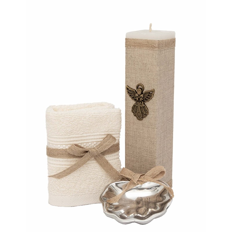 Hermoso Kit de Bautizo con vela cuadrada, concha de Pweter y toalla. Decorado con listones de fibras naturales, con un ángel en metal color oro viejo. Ideal para Bautizo ya sea de niña o niño. Incluye estuche de madera MDF "Mi Bautizo". ¡Simplemente elegante! Este producto es una artesanía que esta hecho por manos mexicanas, que ponen su alma y corazón en cada uno de los detalles que puedes apreciar. Casa Gala.