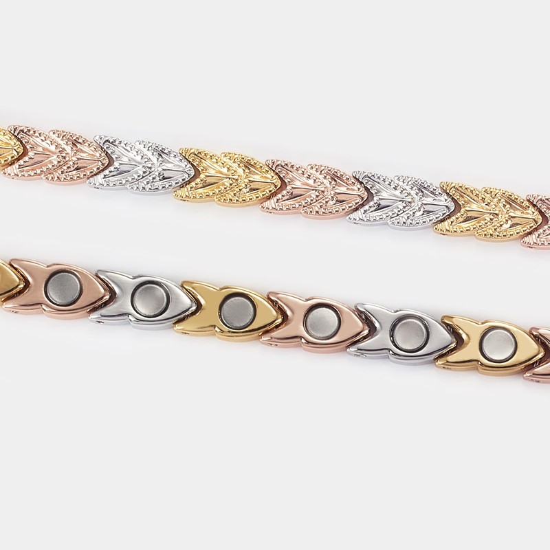 - Magnetic braccialetto è realizzato in acciaio al titanio 316L. Senza piombo e nichel. Il braccialetto non è soggetto a ruggine, scolorimento o corrosione. E non sbiadisce, non si stacca facilmente.