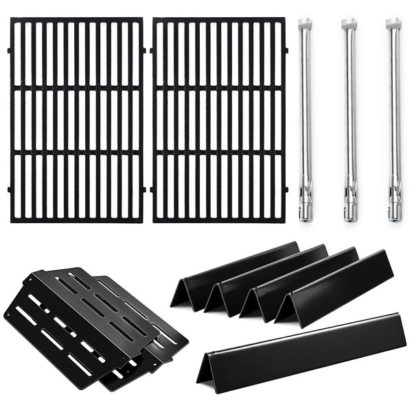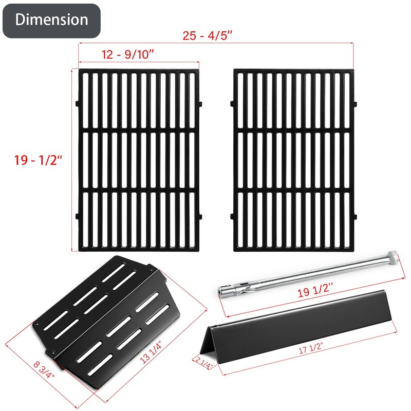 - ✅【DIMENSIONS AND MATERIALS】 19 1/2" (L) inch for each stainless steel 3pcs grill burner tube, 19.5 x 12.9” for each matte enamel cast iron grate, 19.5 x 25.8” for 2pcs weber genesis grates, 2 Pieces 13 1/4 (L) x 8 3/4” (W) for each porcelain steel heat deflectors. 5 Pieces 17 1/2 (L) X 2 1/4 (W) X 2 3/8” (H) for each porcelain steel flavorizer bars. weber genesis 310 replacement parts.