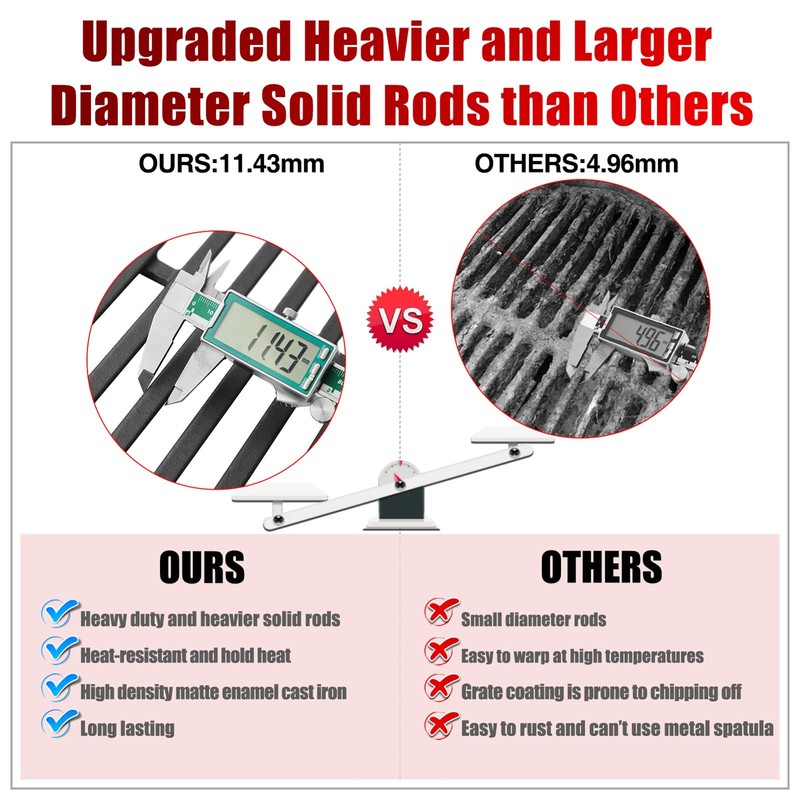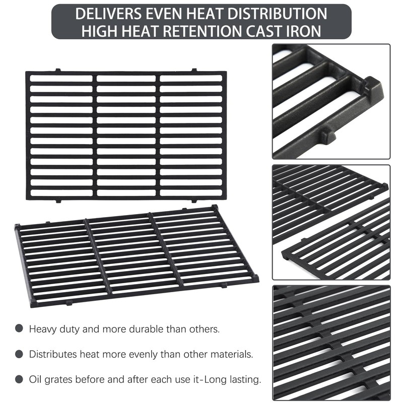 - ✅【UPGRADED HEAVIER, LARGER DIAMETER SOLID RODS】 You will get the weber genesis grill grates that are made of matte enamel cast iron. weber genesis grill parts will last for many years if it's taken care of. ✅【HIGH HEAT RETENTION AND COOK FOOD FAST, DELIVERS EVEN HEAT DISTRIBUTION】 Heavy duty and more durable than others. retaining and transferring heat, perfect for searing and locking. long lasting. ✅ Not like the porcelain coating grate that the coating chips or cracks over time.