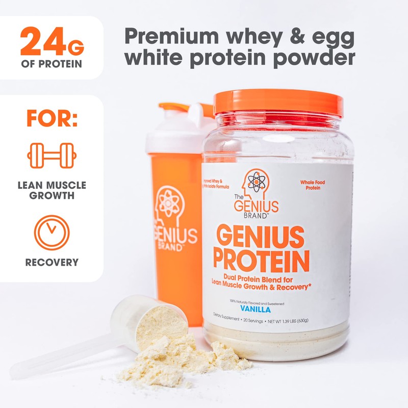 Genius Protein Powder, Vanilla - Dual Protein Blend with Improved Whey Isolate & Natural Egg White for Lean Muscle Building for Men & Women - Grass-Fed Pre & Post Workout Meal Replacement Shake