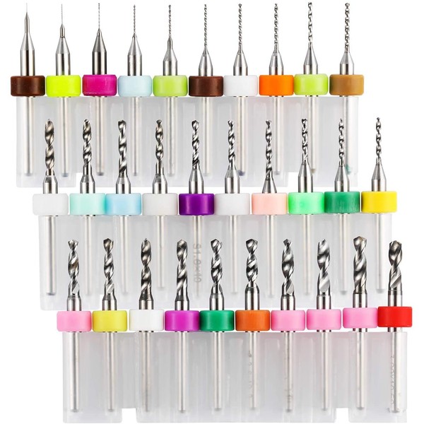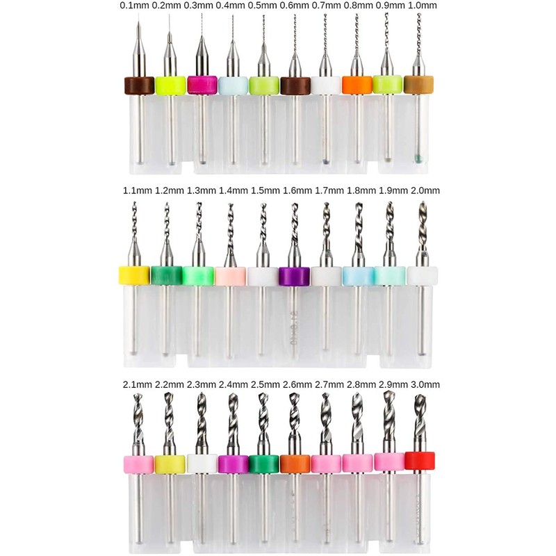 - Various Sizes: 1/8'' shank; bits diameter: 0.1mm, 0.2mm, 0.3mm, 0.4mm, 0.5mm, 0.6mm, 0.7mm, 0.8mm, 0.9mm, 1.0mm, 1.1mm, 1.2mm, 1.3mm, 1.4mm, 1.5m, 1.6mm, 1.7mm, 1.8mm, 1.9mm, 2.0mm, 2.1mm, 2.2mm, 2.3mm, 2.4mm, 2.5mm, 2.6mm, 2.7mm, 2.8mm, 2.9mm, 3.0mm. This Set contains 30 different size drill bits diameter, each size having1 pcs.