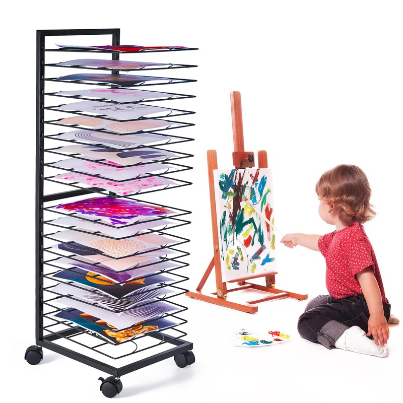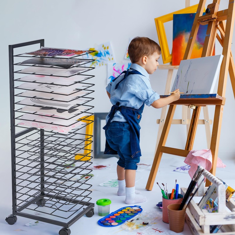 - 【Robust Iron Construction & Stylish】: Built from durable iron with a sleek and modern black exterior design, this painting drying rack is designed to withstand the demands of classroom or studio use. this art drying rack adds a stylish touch to any art studio or classroom. It's designed to help artists and teachers keep their paintings, drawings, and other art projects tidy and organized, ensuring a clean and dry finish
