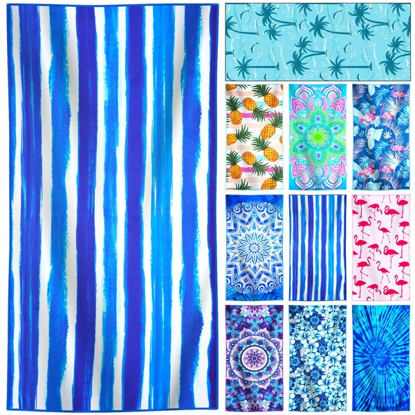 Genovega Microfiber Lightweight Thin Overysized Beach Towel Compact Sandproof Clearance Towels Quick Dry Sand Free Swim Pool Camping Blanket Travel Essentials Accessories Women Men Adults Blue Stripe