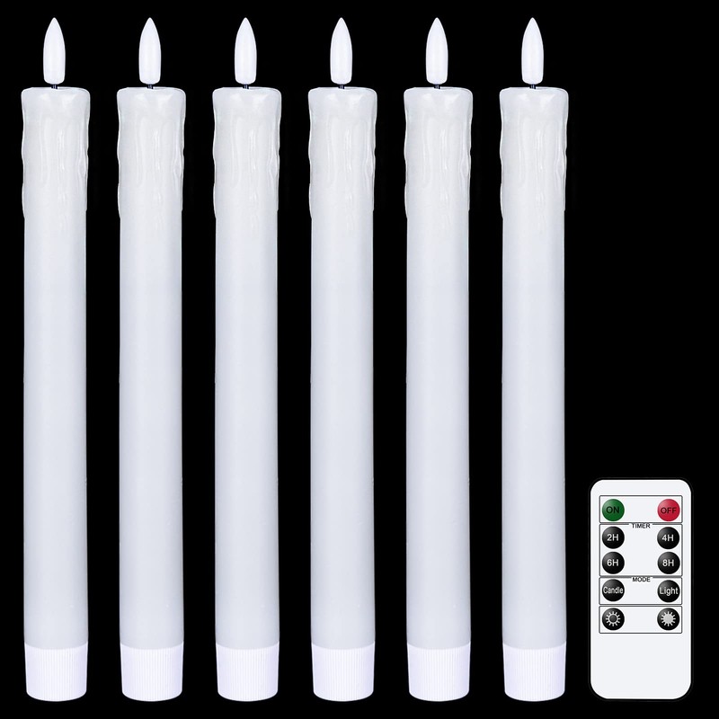 - A COMPLETE SET OF FLAMELESS TAPER CANDLES: This value pack comes with 6 beautiful drip wax flameless taper candles, one remote control with 10 different keys and a super easy to follow operating manual. Specifically, this set includes six flickering flameless taper candles(9.64 inch high x 0.78 inch diameter). Each candle operated by 2 AAA batteries(not include).