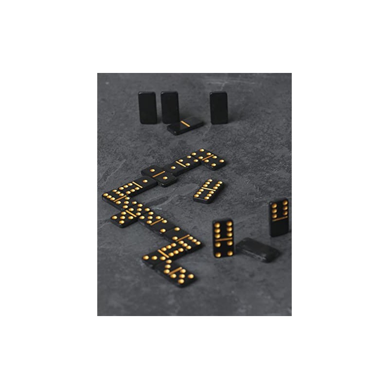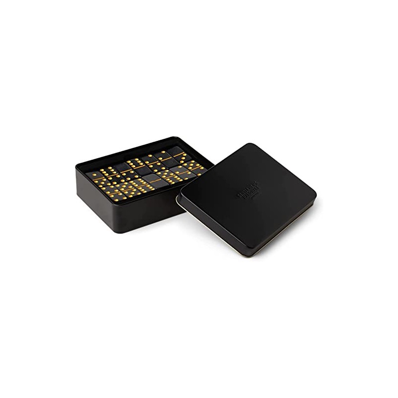 - Contents: Inside the tin you will find 28 black and gold dominoes and game instructions.