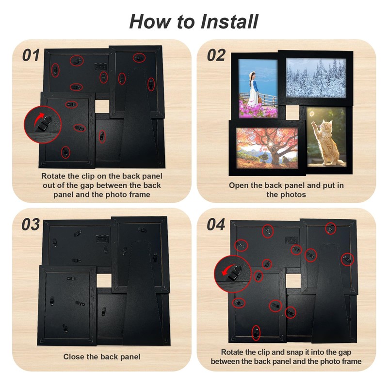 - EASY TO ASSEMBLE The picture frame comes with a flexible backing board and fixings, so you can easily insert photos and exchange them at any time. Even if you use the picture frame for the first time, it can be easily assembled. Whether you place it on the desk or on the wall, it is stable and does not slip, making your home decoration more personal and meeting daily presentation needs without any problems.