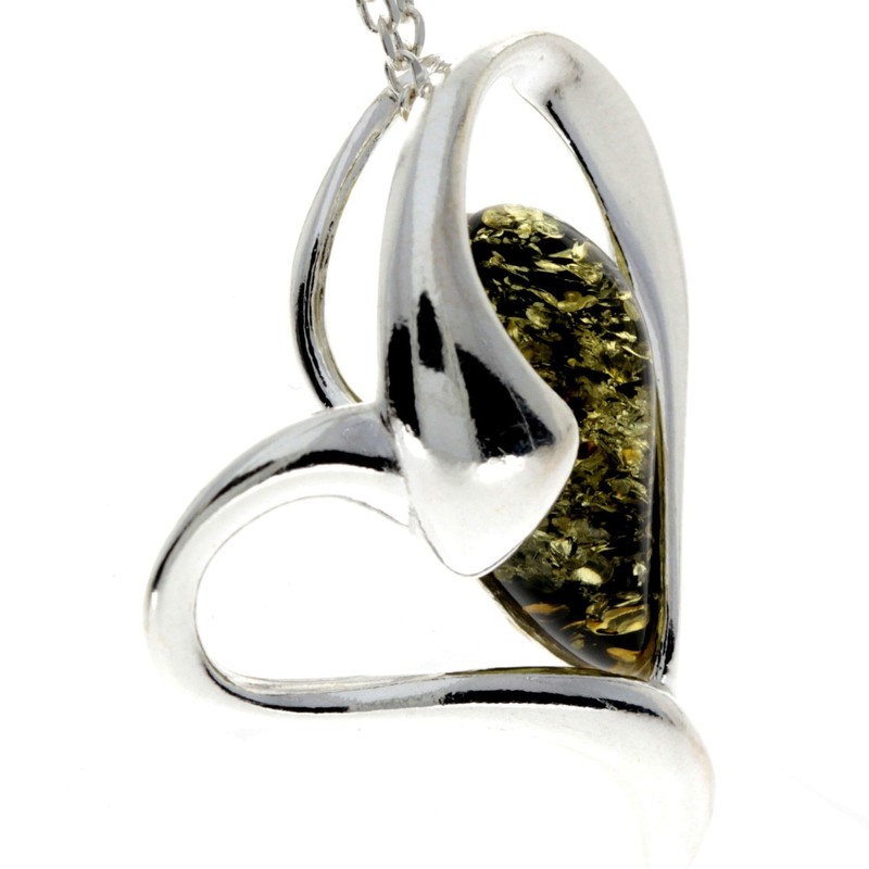 Genuine Baltic Amber & Sterling Silver Modern Heart Pendant without Chain - GL346 (Green)