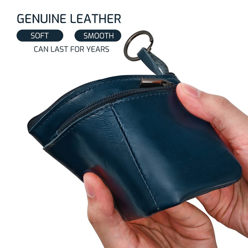 Genuine Leather Coin Purse Triple Zipper Card Holder with Key Ring, darkblue, coin pocket