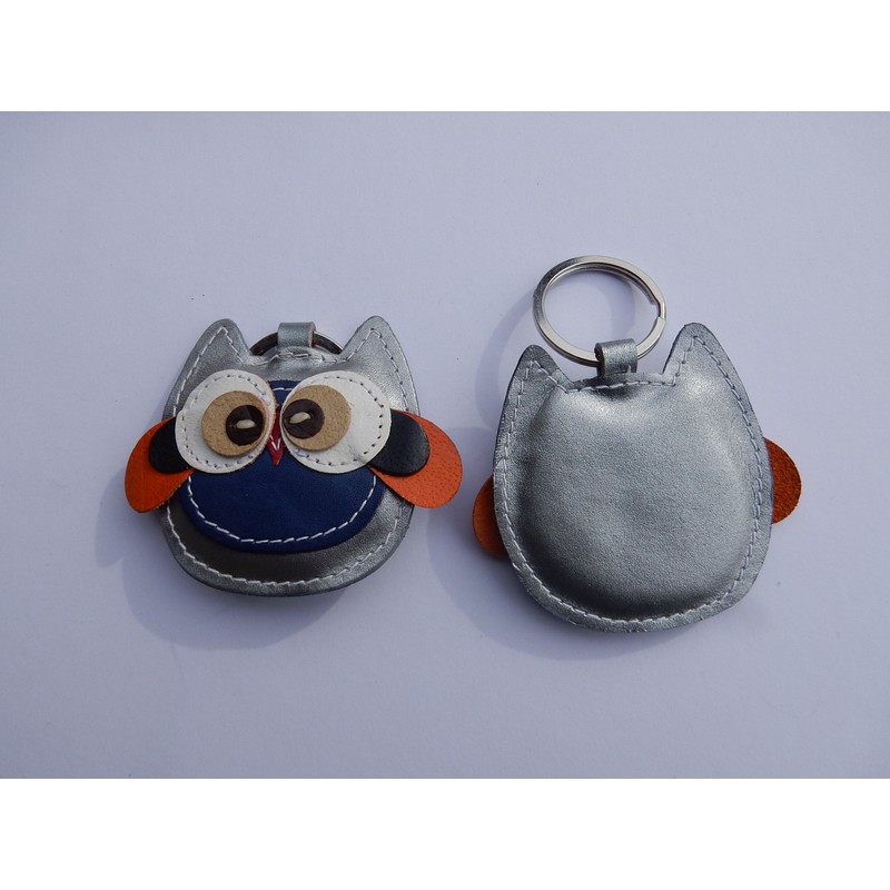 GENUINE LEATHER KEY RING WITH FUNNY OWL PENDANT, SILVER/BROWN, 6 x 6 cm
