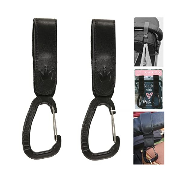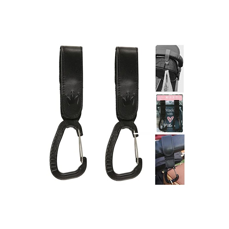 Genuine Leather Stroller Hook by Motheric - Baby Stroller Leather Hooks, Stroller Hooks for Diaper Bags, Leather Stroller Clips - 2Pcs - Stroller Bag Hook - Black