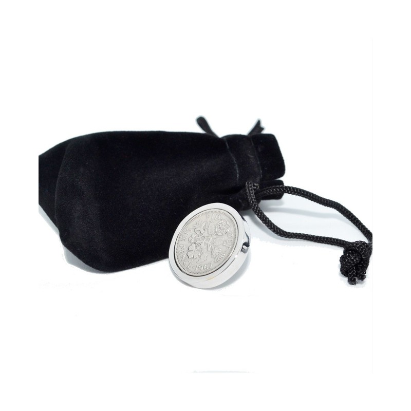 - The genuine sixpence is highly polished and set in a rhodium plated mount