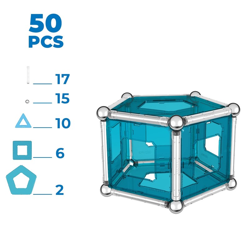 - Geomag 022 Pro-L Kit - 50 Piece Magnetic Construction Set comes with 17 magnetic rods, 15 non-magnetic steel spheres, 10 triangles, 6 squares and 2 pentagons panels