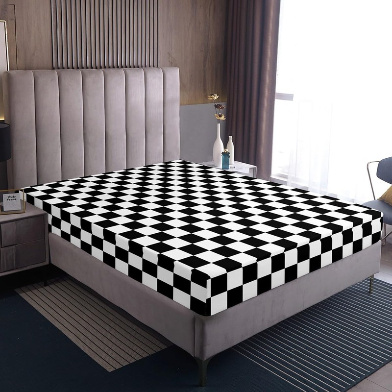 Geometric Checkerboard Patchwork Kids Fitted Sheet Full Size,Abstract Plaids Grids Chess Bedding Set,Girls Boys Room Decor,Modern Fashion Black White Bed Sheet,2 Pillowcases(No Flat)