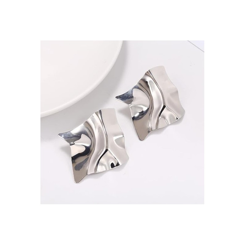 Geometric Texture 3D Large Metal Simple Modern Ripple Crumpled Earrings Irregular Exaggerated Sequins Minimalism Simple Earrings Rectangle Large Leaf Trendy Jewley Gifts-E Silver
