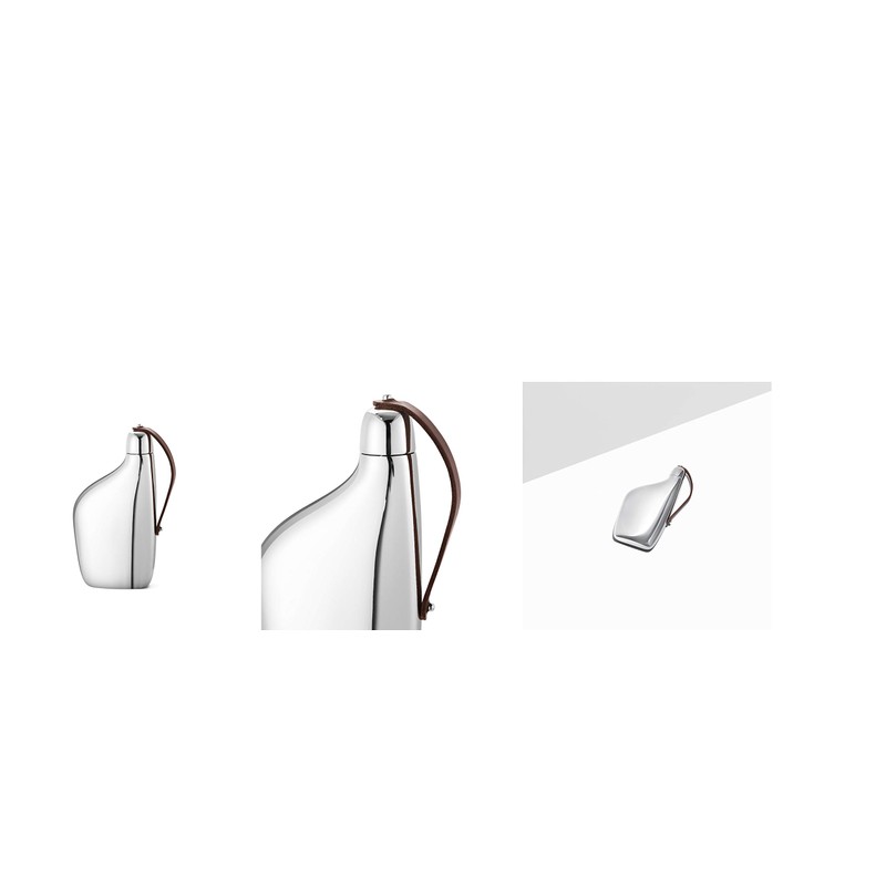 - フラスコ: 人間工学に基づいて設計されたステンレススチール製ヒップフラスコで、少量の水や酒を持ち運べます。 鏡面研磨仕上げ、天然皮革製のキャリーハンドル付き。