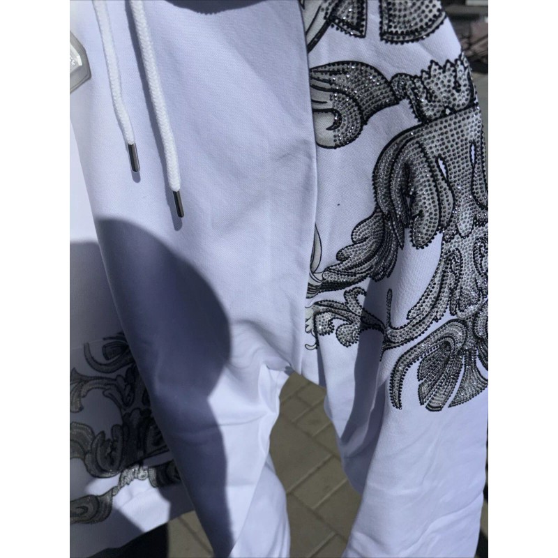Made of comfortable cotton material that is machine washable, this hoodie is easy to care for. The white color with rhinestone accents adds a touch of elegance to the overall look. It comes in a size 5XL(see below), making it suitable for big and tall men. The hooded design and kangaroo pocket make it perfect for any casual occasion.