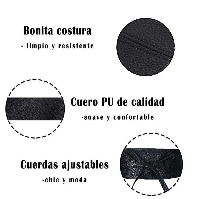 <2>El cinturón de piel sintética tiene una longitud total de 220 cm,un ancho de cintura de 7 cm y un cordón de 54 cm. Este cinturón flexible de piel sintética proporciona una elegante y original silueta en forma de reloj de arena,perfecta para las mujeres a las que les gusta el toque original.