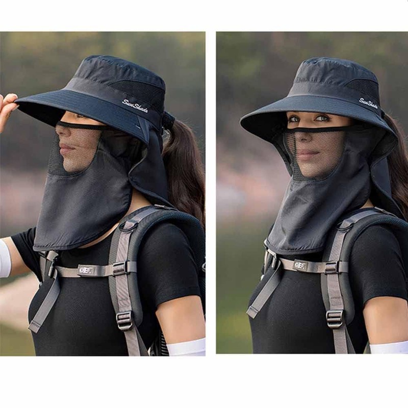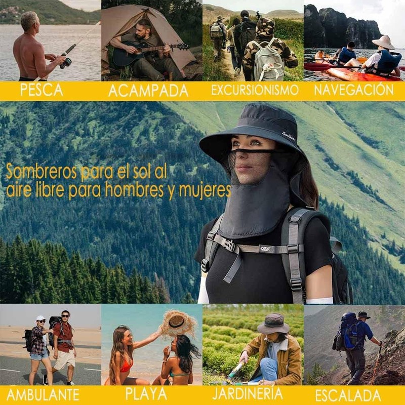 - Protección solar y contra el viento de 360 °: sombrero al aire libre, ala ancha, solapas faciales y de cuello (solapa extraíble), mantenga la luz solar lejos de la cabeza, la cara y el cuello. Diseño doble a prueba de viento con mentonera ajustable y hebilla en la solapa del cuello