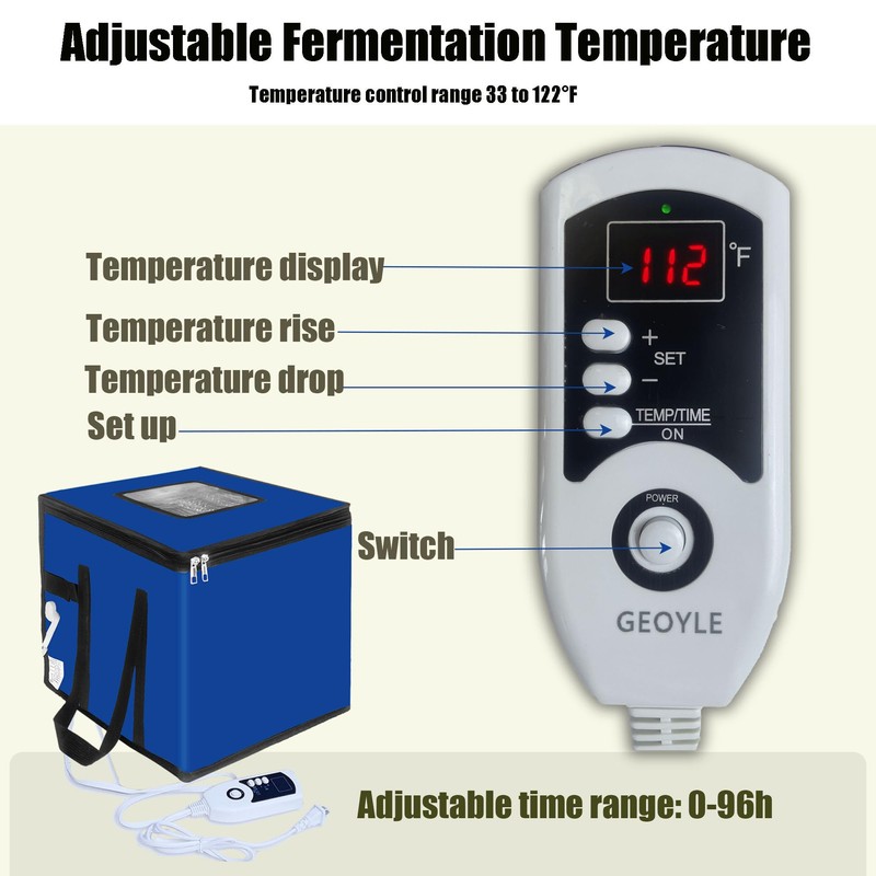 - Adjustable Temperature/Time: The foldable proofing box is equipped with a thermostat, with an adjustable temperature range of 33°F-122°F and an adjustable time range of 0 minutes-96 hours. You can adjust the required value through the temperature/time button on the thermostat. It allows you to easily set the temperature and time.