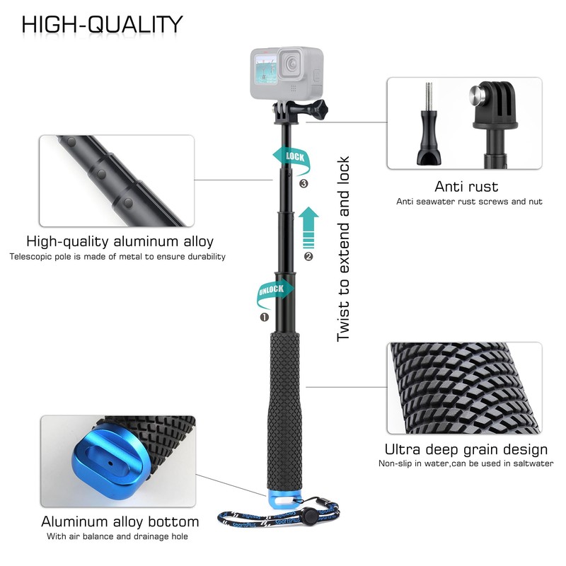 - Multi-purpose for Use: It can be used as hand grip, waterproof selfie stick and underwater pole for your action cameras and smartphones. Portable for carrying and strong usability in various conditions such as traveling, surfing,snorkeling, scuba diving, snowboarding, vlogging.