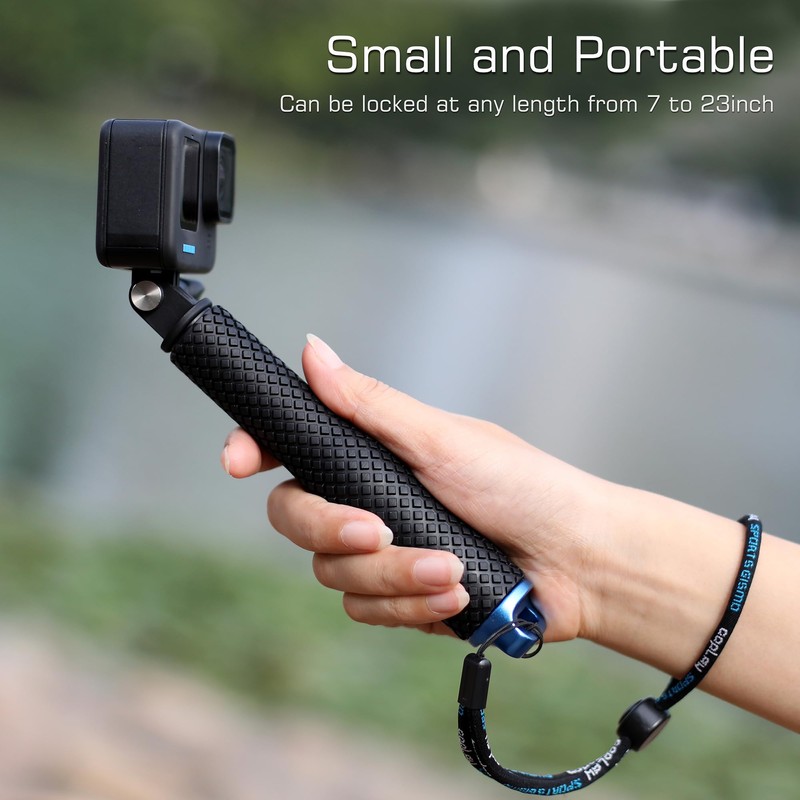 - Pocket Size and easy to carry: 7" when retracted, extended up to 23", this extension pole can be locked at any desired length in this range. Great to take outside for outdoor activitives,diving,travel vlog,hiking.