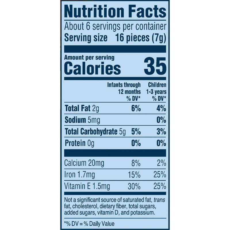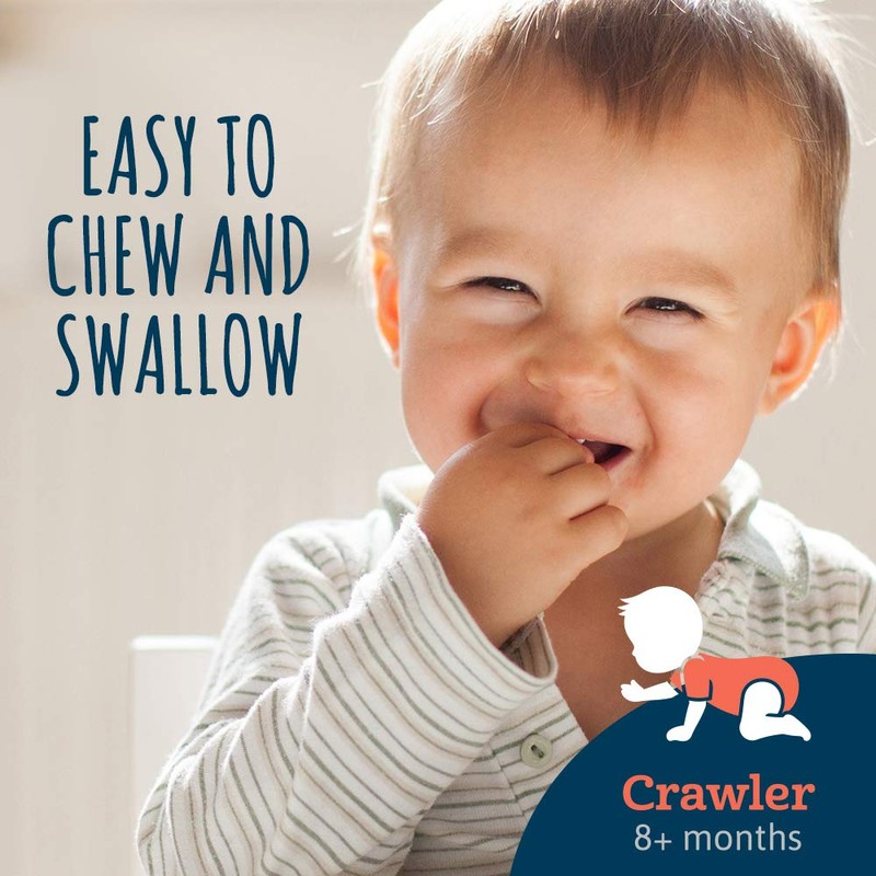 - WHOLE GRAINS & NUTRIENTS: Lil Crunchies Snacks have 2 grams of whole grains per serving, 15% daily value of iron and 20% of vitamin E, making them an ideal snack for your older baby learning to self-feed. Not made with genetically engineered ingredients.