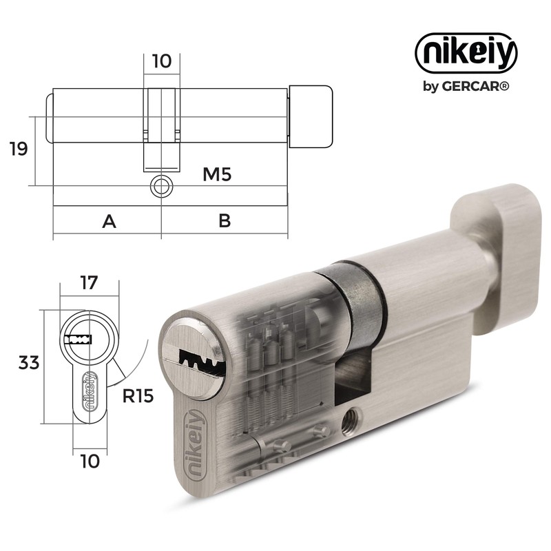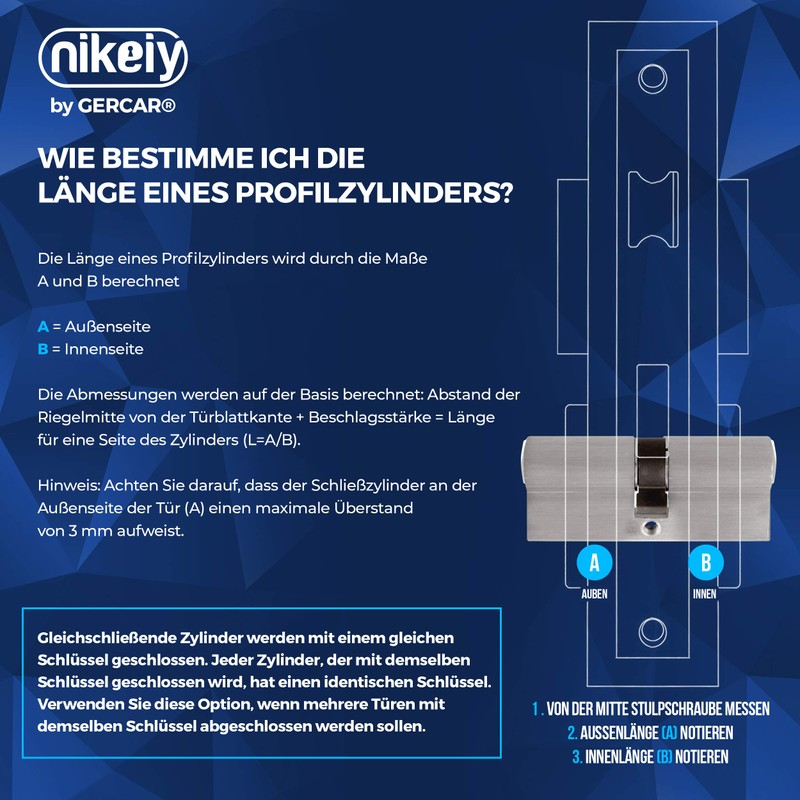 - High-quality heavy design – matt nickel-plated. Enjoy more safety without costly retrofitting of expensive safety devices. With our profile cylinder from GERCAR you are on the safe side. Available in double cylinder or knob cylinder, multiple sizes available. Meets and exceeds safety class 2 EN 1303:2007+AC:2008 in essential points. More security.