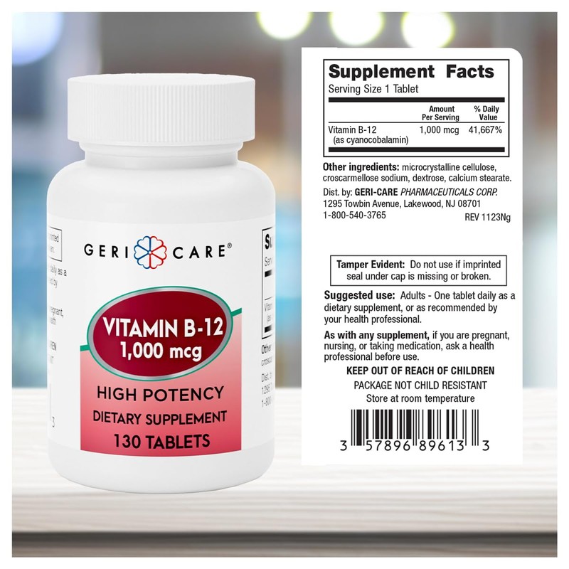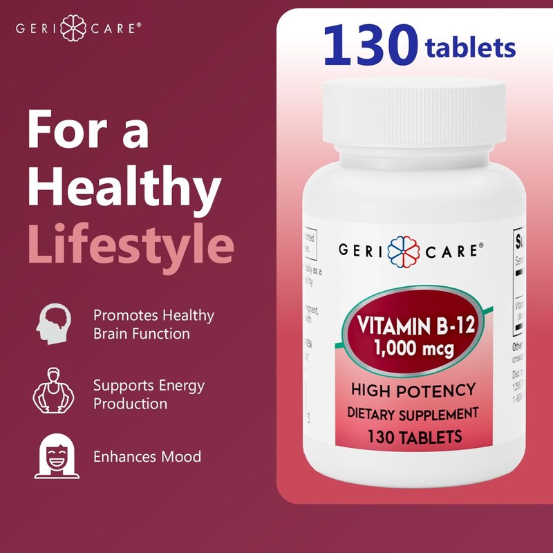 GeriCare GeriCare Vitamin B-12 1000mcg High Potency Tablets, Premium Dietary Supplement for Boosting Energy, Supporting Brain Health, and Maintaining a Healthy Nervous System 130 Count (Pack of 1)