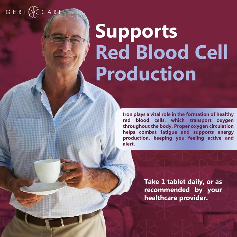 GeriCare Iron 65mg Plus Vitamin C 125mg Tablets – High-Absorption Iron for Anemia Support, Red Blood Cell Production, Fatigue Reduction, and Immune Health – 60 Count