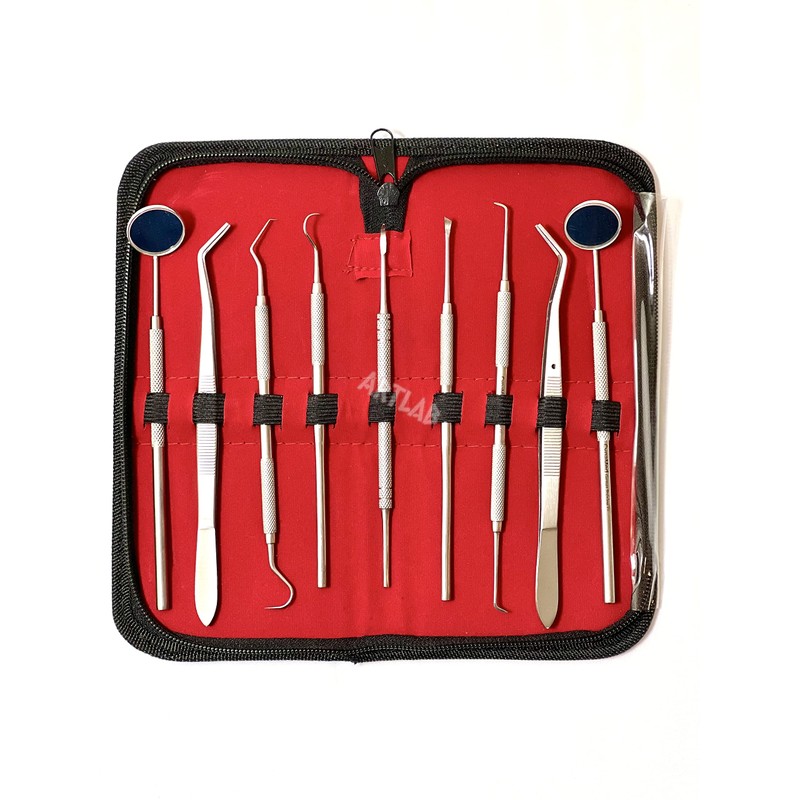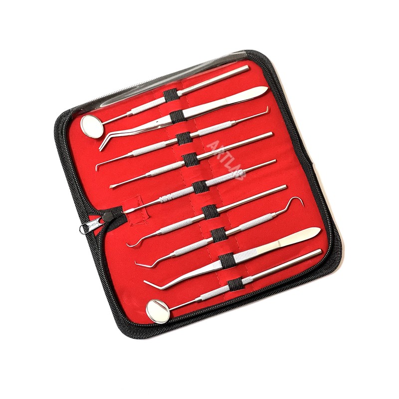 German Professional Dental Hygiene Kit-Calculus & Plaque Remover Set-Tarter Scraper,Tooth Pick,Dental Scaler And Mouth Mirror Instruments-Plaque Remover for Teeth (DENTAL SET OF 9 IN POUCH)