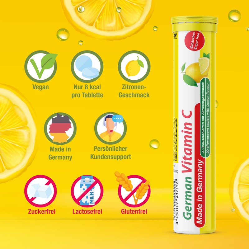 German Vitamin C Effervescent Tablets Pack of 140 - Lemon Flavour, Sugar-Free, Vegan - 180 mg Vitamin C - T&D Pharma German - Made in Germany