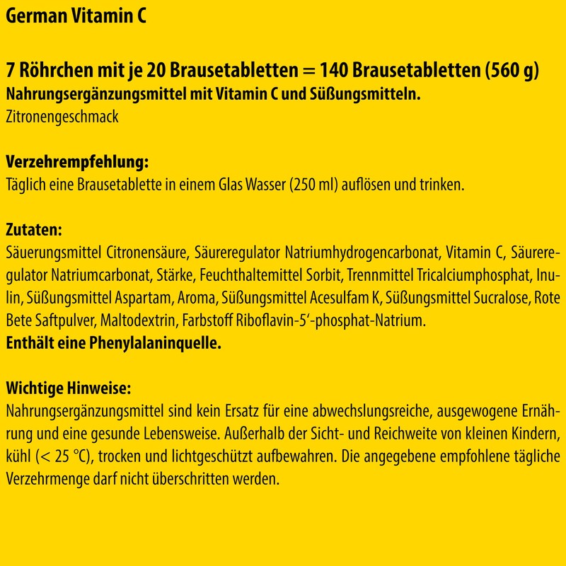 - With 180 mg vitamin C per effervescent tablet, for daily use